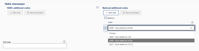 Provide here the required information about the TARIC additional codes and national additional codes. Read the detailed guidance below.