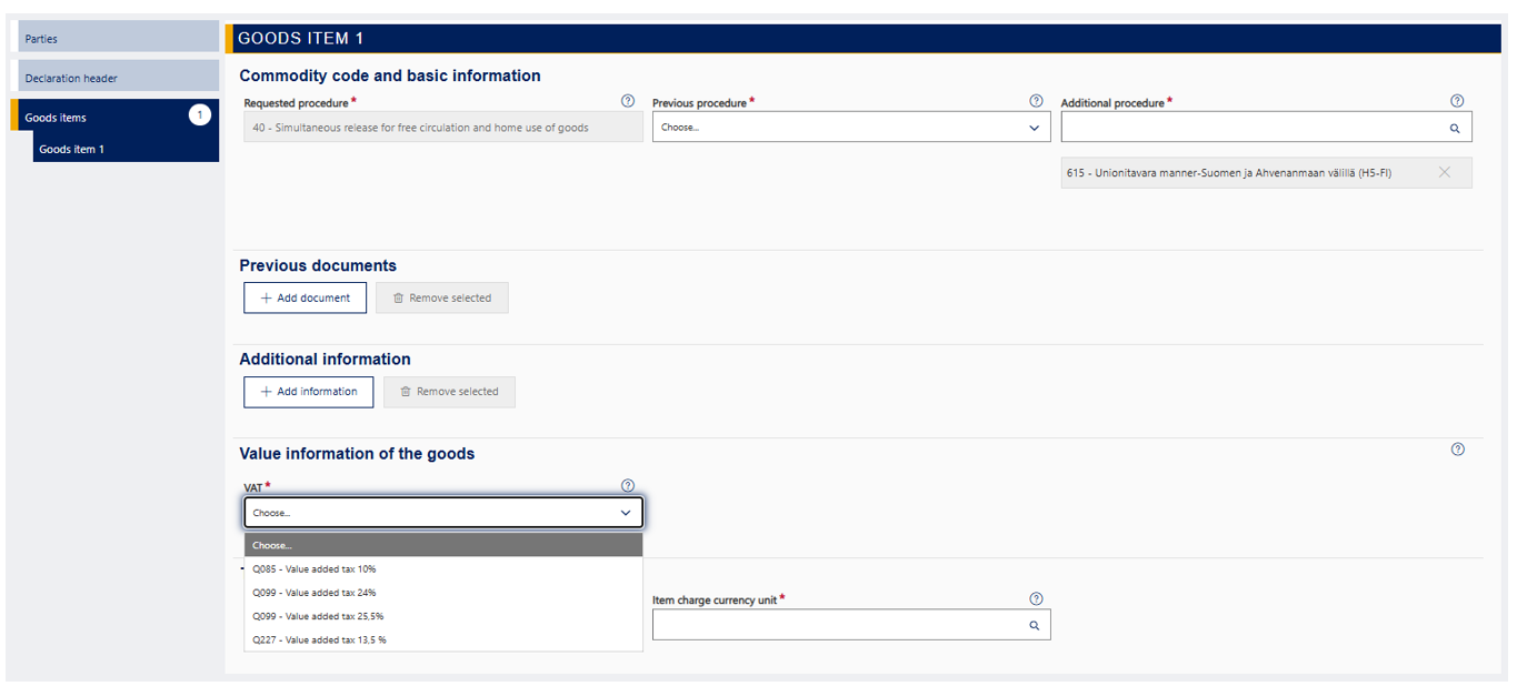 If the importer isn’t registered for VAT, select the VAT rate from the drop-down menu. The general VAT rate is 25,5%, but e.g. for newspapers and periodicals it is 10% and for books, medicines, art items and foodstuffs 13,5%.