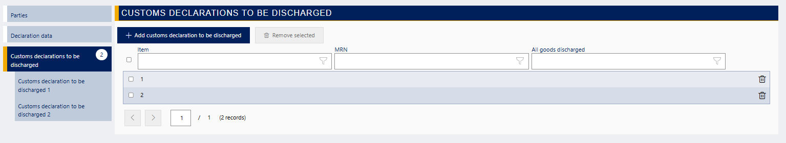If you have added an additional goods item by mistake, you can remove it from the list of goods items by ticking the box next to the “Goods item” column and clicking on the button “Remove selected”. The “Waste bin” button at the end of the goods item row is not working for the time being.