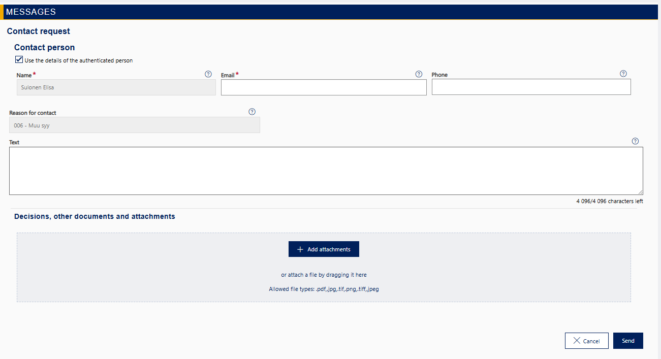 Add an attachment, if the additional information request requires it. Write a description of the attachment in the field that opens. The supported attachment file types are PDF, JPG, PNG and TIF. The maximum attachment size is 5 MB.