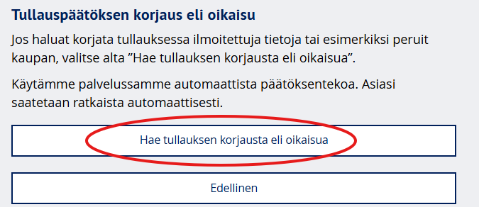 4. Valitse, että haet tullauksen korjausta eli oikaisua.