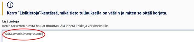 7. Kirjoita ”Lisätietoja”-kenttään ”Väärä arvonlisäveroprosentti”.