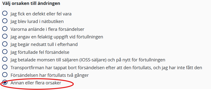 6. Välj ”Annan eller flera orsaker” som orsak till ändringen.