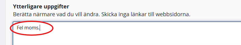 7. Skriv ”Fel moms” i fältet ”Ytterligare uppgifter”.