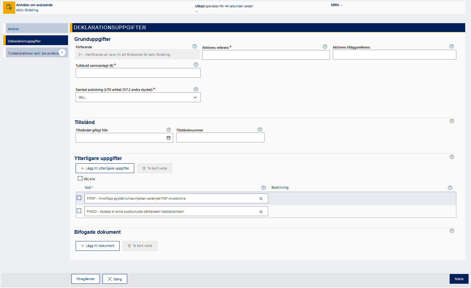 Under ”Deklarationsuppgifter” ska du ange uppgifter som är genomsamma för hela anmälan om avslutande, dvs. grunduppgifter, tillstånd, ytterligare uppgifter och bifogade dokument.