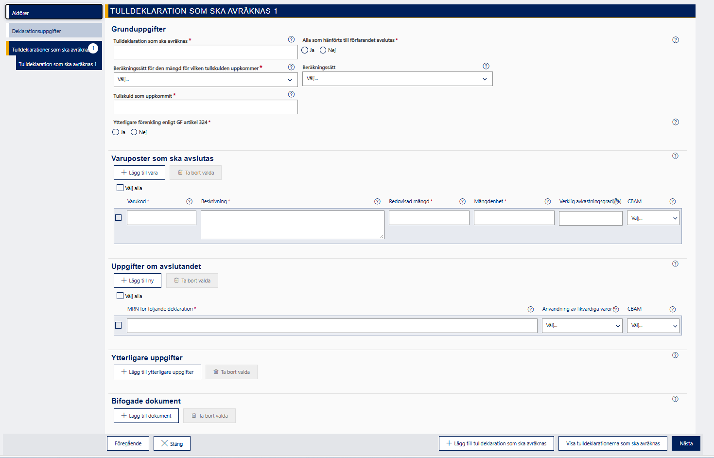 Du kan med samma anmälan om avslutande ange uppgifter om flera tulldeklarationer. På en ”Tulldeklaration som ska avräknas”-sida kan man dock endast ange uppgifter om en tulldeklaration. Om det behövs kan du lägga till tulldeklarationer via knappen ”+ Lägg till tulldeklaration som ska avräknas”.
