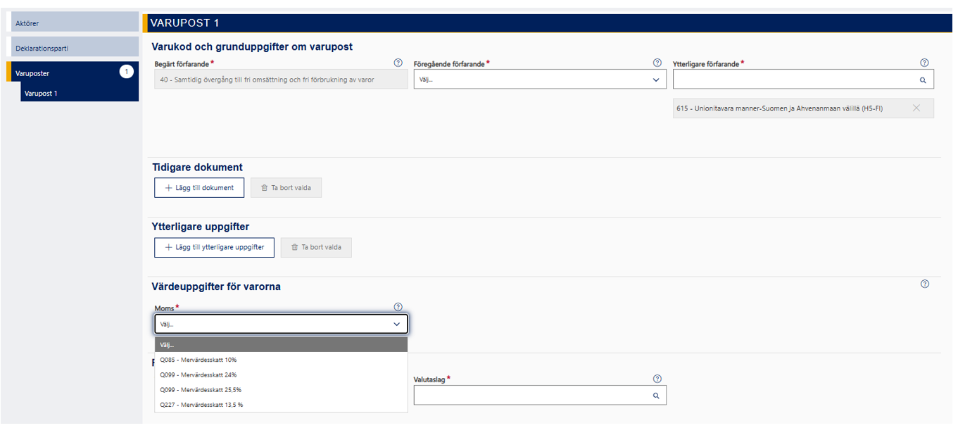 Välj ett eller flera ytterligare förfaranden för varan i rullgardinsmenyn. Ange alla koder för ytterligare förfarande som behövs.