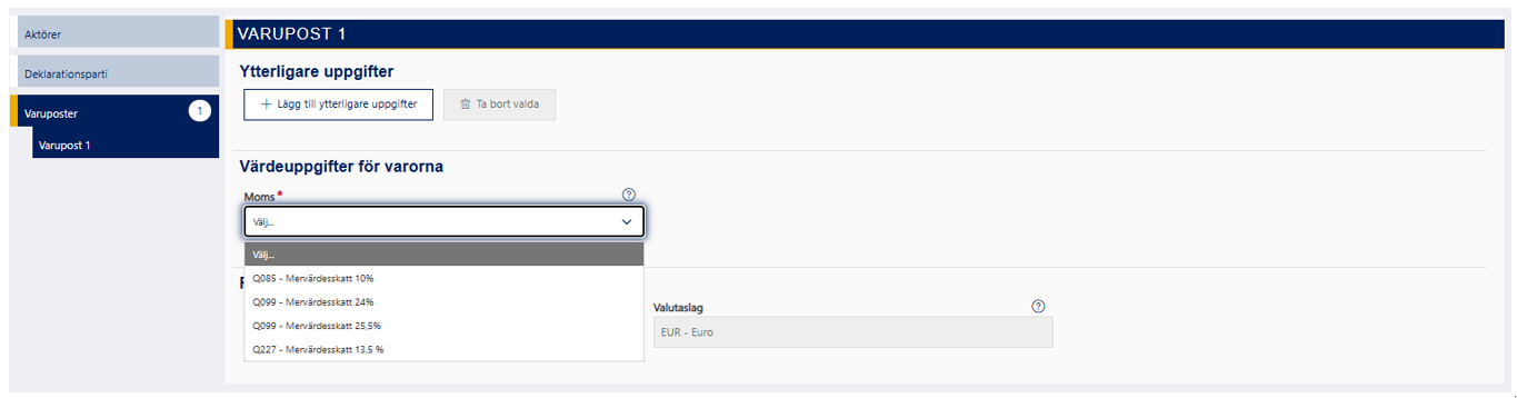 - värdeuppgifter för varorna (momssats)