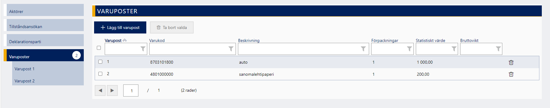 På sidan ”Varuposter” ser du ett sammandrag av de varuposter som du angett. Du kan ange uppgifter om varuposten genom att välja ”Varupost 1” i navigationen till vänster.