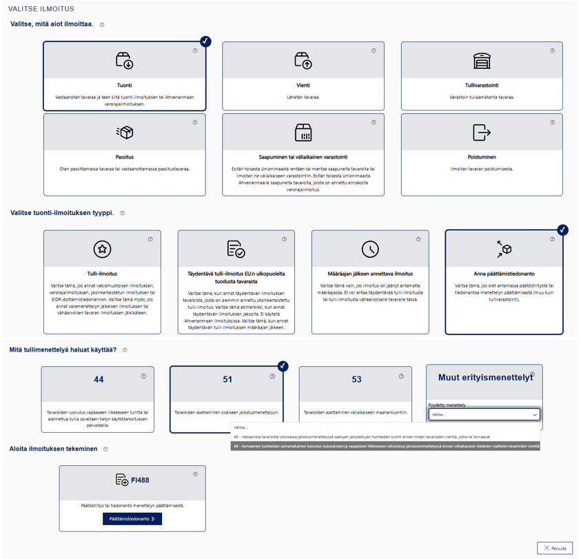 Kun olet valinnut haluavasi antaa tuonnin ilmoituksen, sinun pitää seuraavaksi valita tarkemmin, minkälaisen ilmoituksen haluat antaa. Vaihtoehdot tulevat näkyviin aiempien valintojesi perusteella. Lue tarkemmat ohjeet alta.