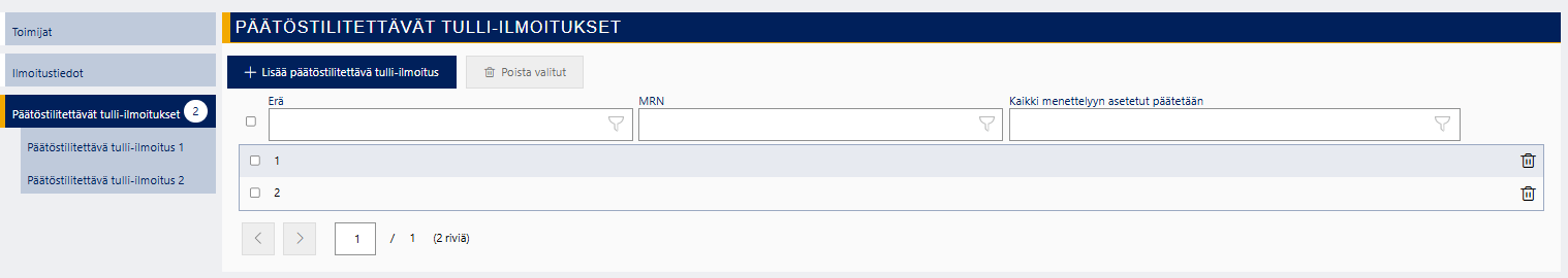 ”Päätöstilitettävät tulli-ilmoitukset” -näytöllä näet yhteenvedon päätöstilitettävistä eristä. Pääset antamaan erän tietoja valitsemalla sivunavigaatiosta ”Päätöstilitettävät tulli-ilmoitukset 1”.