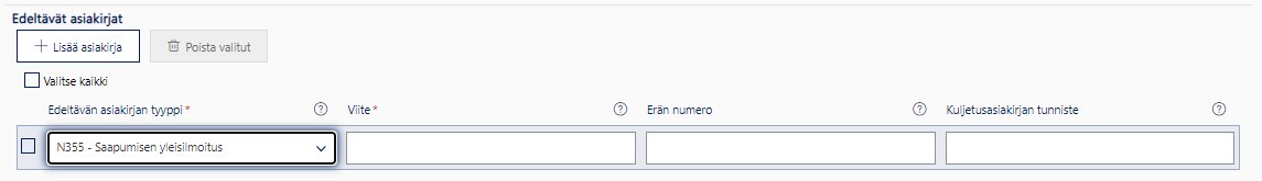 Ilmoita lisäksi kuljetusasiakirjan tunniste, jos edeltävä asiakirja on N355 – Saapumisen yleisilmoitus, joka on annettu komission ICS2-järjestelmään, tai jos edeltävä asiakirja on ”N337 – Väliaikaisen varastoinnin ilmoitus”.
