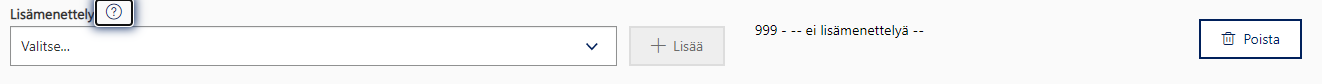 Valitse alasvetovalikosta tarvittavat lisämenettelykoodit. Huomioi, että sinun pitää tämän jälkeen valita painike ”+ Lisää”. Vasta tämän jälkeen valitsemasi lisämenettely tallentuu ja tulee näkyviin.