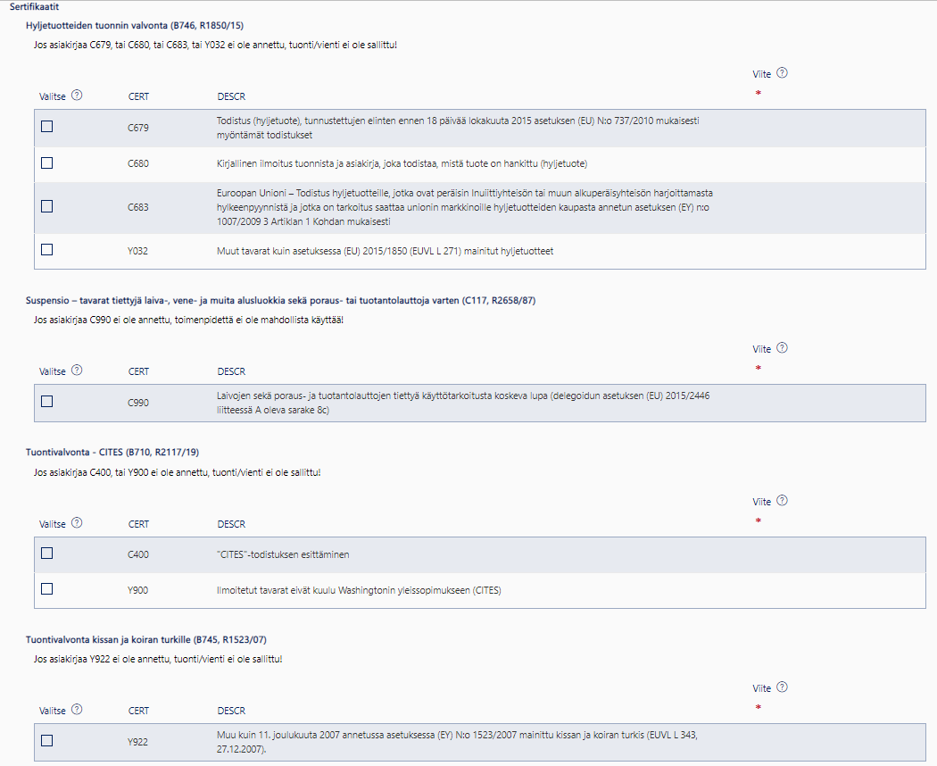Tavaraan voi kohdistua useita rajoituksia ja niihin liittyviä sertifikaatteja. Sertifikaatit näkyvät palvelussa automaattisesti aiemmin ilmoittamasi alkuperän ja tullinimikkeen perusteella. Sinun on otettava kantaa jokaiseen niistä joko aktivoimalla valintaruutu tai jättämällä se tyhjäksi.