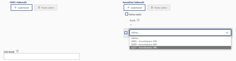 Ilmoita tässä kohdassa vaaditut tiedot TARIC-lisäkoodeista ja kansallisista lisäkoodeista. Lue tarkemmat ohjeet alta.
