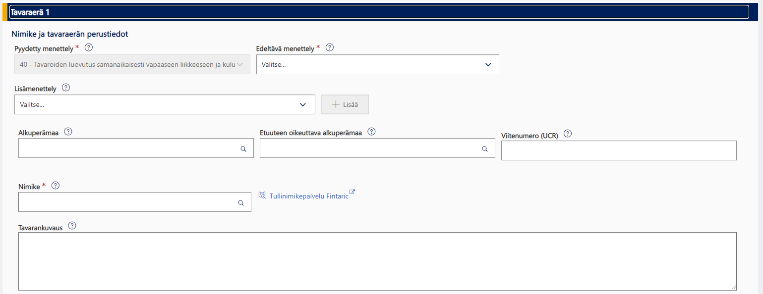 Ilmoita tässä kohdassa vaaditut perustiedot tavaraerästä. Lue tarkemmat ohjeet alta.