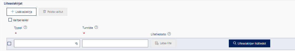 Voit lisätä liiteasiakirjan painikkeesta ”+ Lisää asiakirja”. Täytä ainakin sarakkeet ”Tyyppi” ja ”Tunniste”.