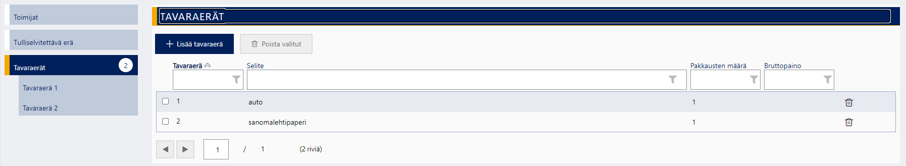Jos olet lisännyt vahingossa ylimääräisen tavaraerän, voit poistaa sen tavaraerälistauksesta valitsemalla valintaruudun tavaraerän numeron vierestä ja painamalla painiketta ”Poista valitut”. Tavaraerän rivin lopussa oleva ”Roskakori”-painike ei toimi toistaiseksi.