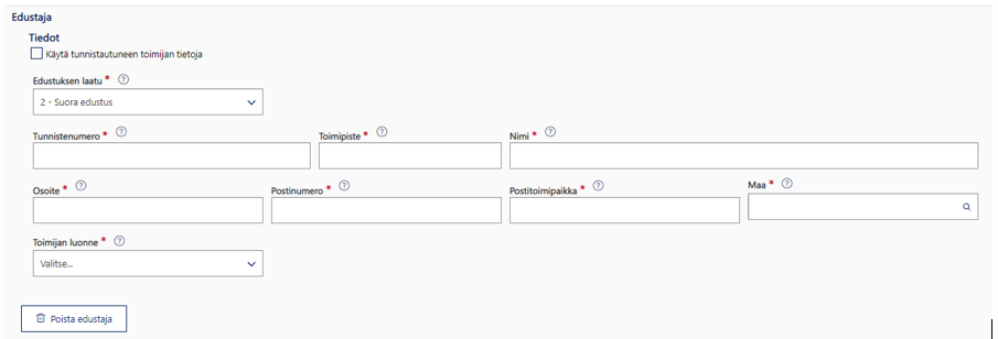 Jos olet vahingossa avannut edustajan tiedot painikkeesta ”+ Lisää edustaja” mutta edustajaa ei ole, poista edustajan tiedot painikkeesta ”Poista edustaja”.