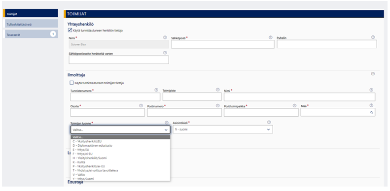 Jos olet tallentanut tietosi etukäteen asetuksiin etkä käytä edustajaa, voit valita valintaruudun ”Käytä tunnistautuneen toimijan tietoja”. Tällöin palvelu täyttää ilmoitukseen automaattisesti omat tietosi ”Tuoja”-kohtaan. Muussa tapauksessa syötä tuojan tunnistenumero, nimi, katuosoite, postinumero, postitoimipaikka, maa ja toimijan luonne. Toimijan luonne valitaan alasvetovalikosta.