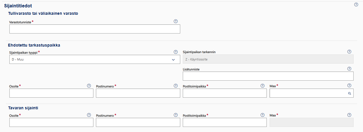 Sijaintitiedoksi ilmoitetaan joko varastotunniste tai tavaran sijaintipaikan osoitetiedot.