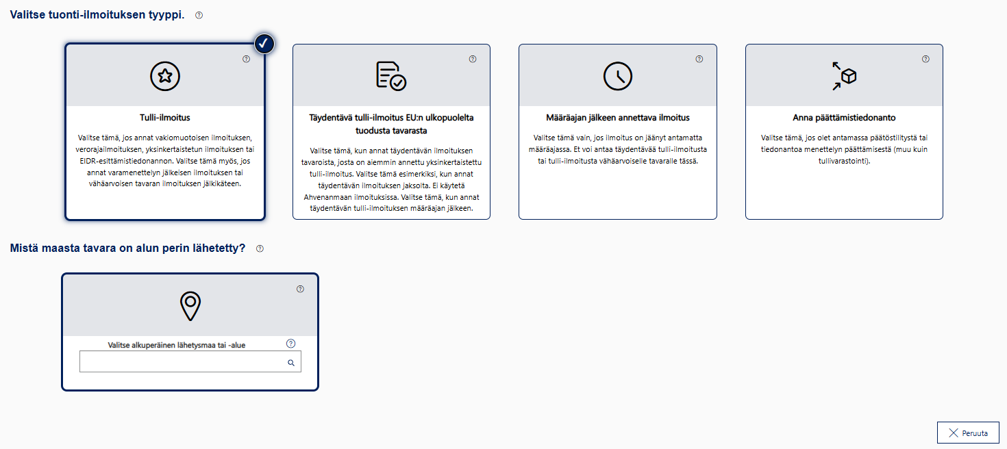 Kun olet valinnut haluavasi antaa tuonnin ilmoituksen, sinun pitää seuraavaksi valita tarkemmin, minkälaisen ilmoituksen haluat antaa. Vaihtoehdot tulevat näkyviin aiempien valintojesi perusteella. Lue tarkemmat ohjeet alta.